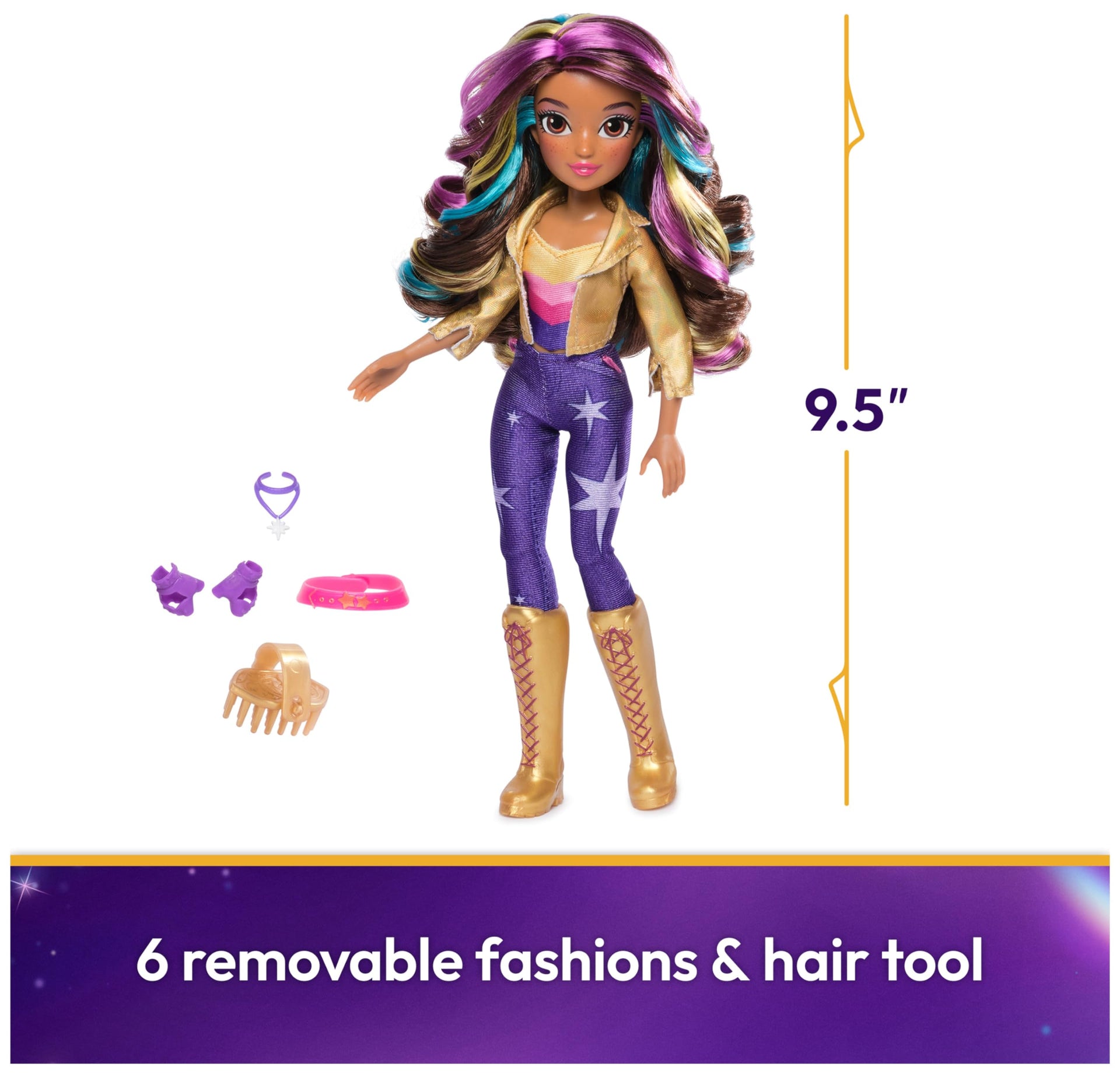 - Includes: 1 Doll, 6 Removable Fashion Pieces, 1 Hair Styling Tool