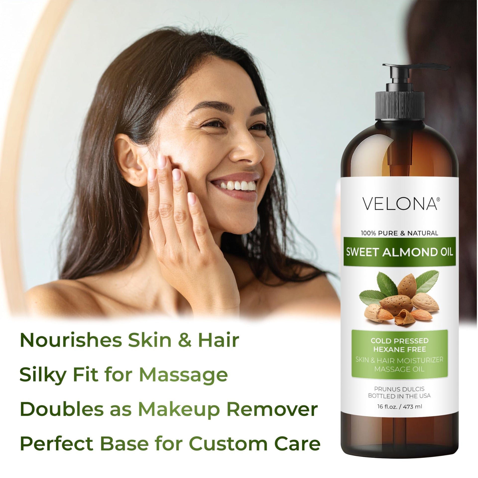 - Sweet Almond Oil: 100% Pure and Natural Carrier Oil. Cold Pressed. Not Diluted, Non-GMO, No Additives, No Fragrance, Chemical Free, Alcohol Free.