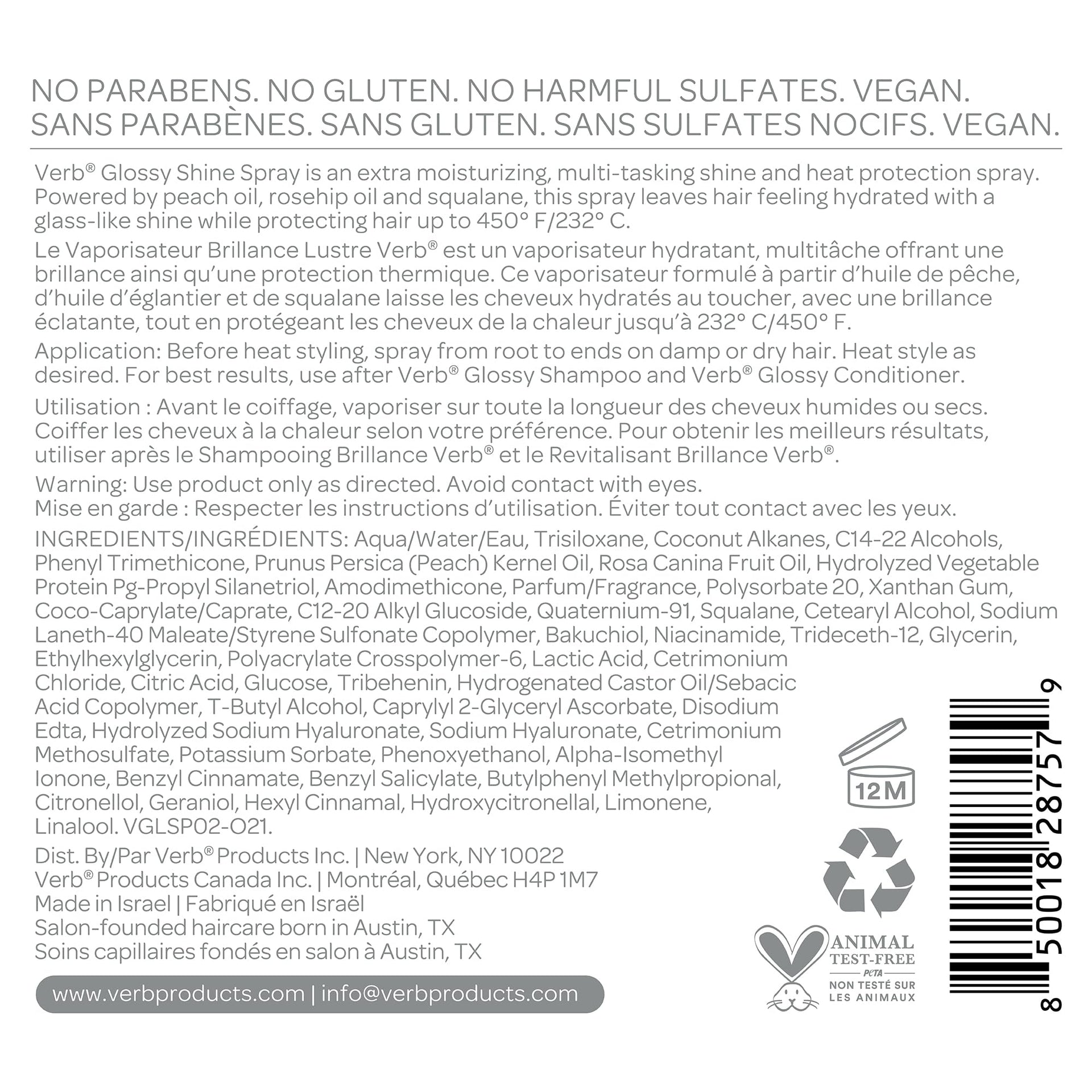 - EXTRA HYDRATION & ULTRA SHINE: Verb Glossy Shine Spray is ideal for all hair types and textures and those looking to add extra shine or protect hair from heat styling up to 428F/220C