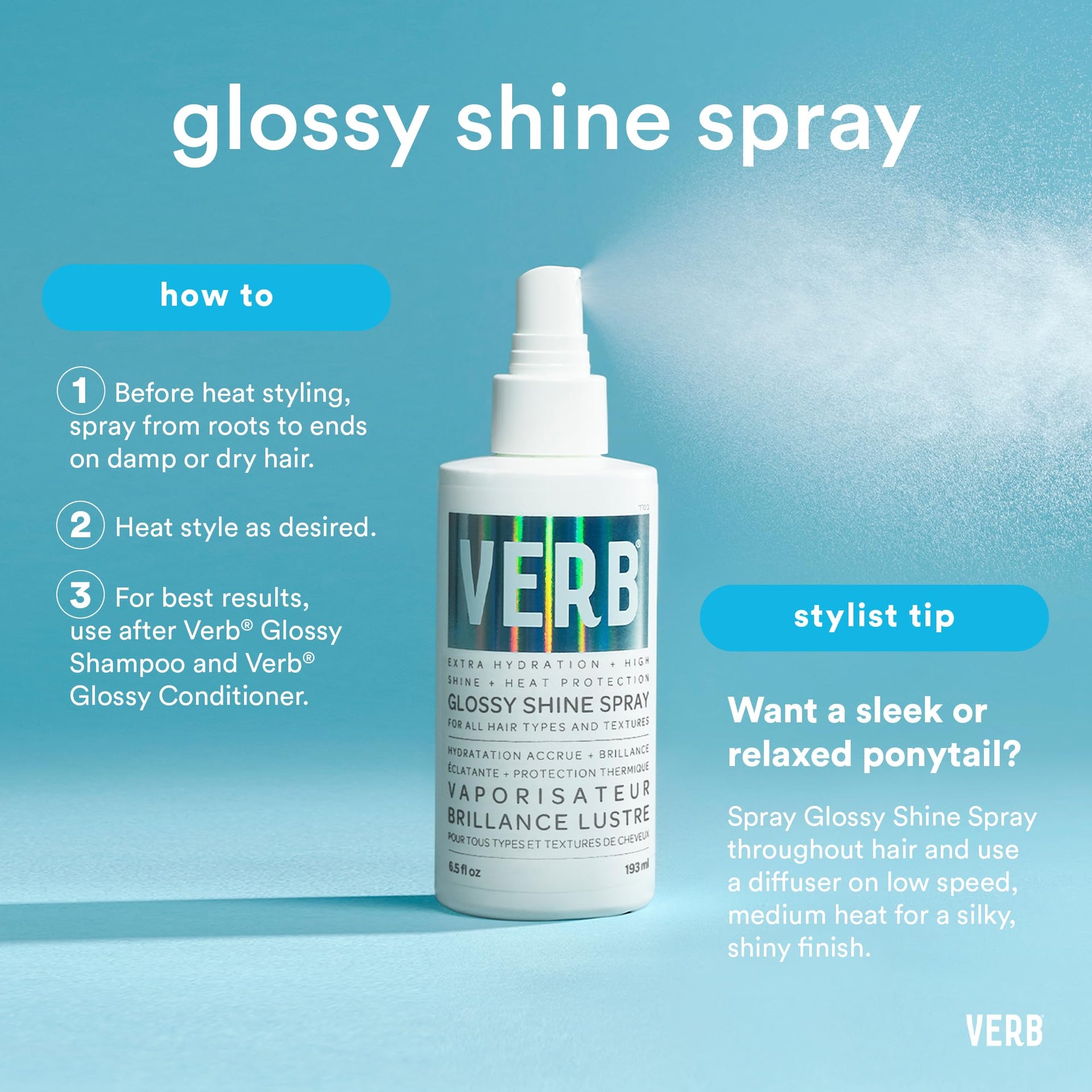 - HOW TO USE: Before heat styling, spray the glossy hair spray from root to ends on damp or dry hair, and heat style as desired; for best results, use after Verb Glossy Shampoo and Verb Glossy Conditioner