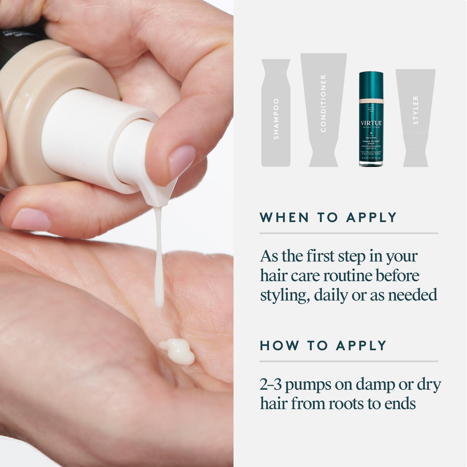 - Apply 2–3 pumps from roots to ends on damp or dry hair