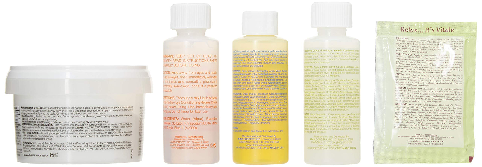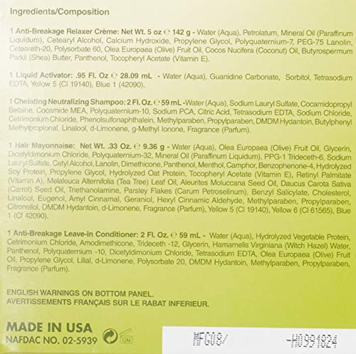 Details: VITALE Olive Oil Conditioning No-Lye Relaxer touch-up system is specially formulated with olive oil, coconut oil and vitamins for double scalp nourishment and protection while relaxing the hair adding body and shine. Olive oil helps to reduce and repair damaged hair, encourages hair growth, and eliminates impurities that may clog hair follicles that prevent hair growth. Kit includes a chelating shampoo that eliminates the chalky build up associated with No-Lye Relaxer kits.