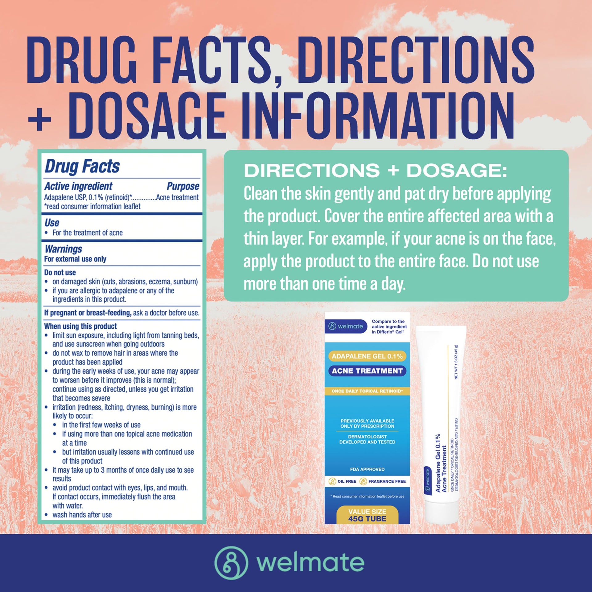 WELMATE Adapalene Gel 0.1% Acne Treatment Cream – Daily Topical Skincare, Pimple & Acne Care, Oil & Fragrance Free, 1.6oz (45g)