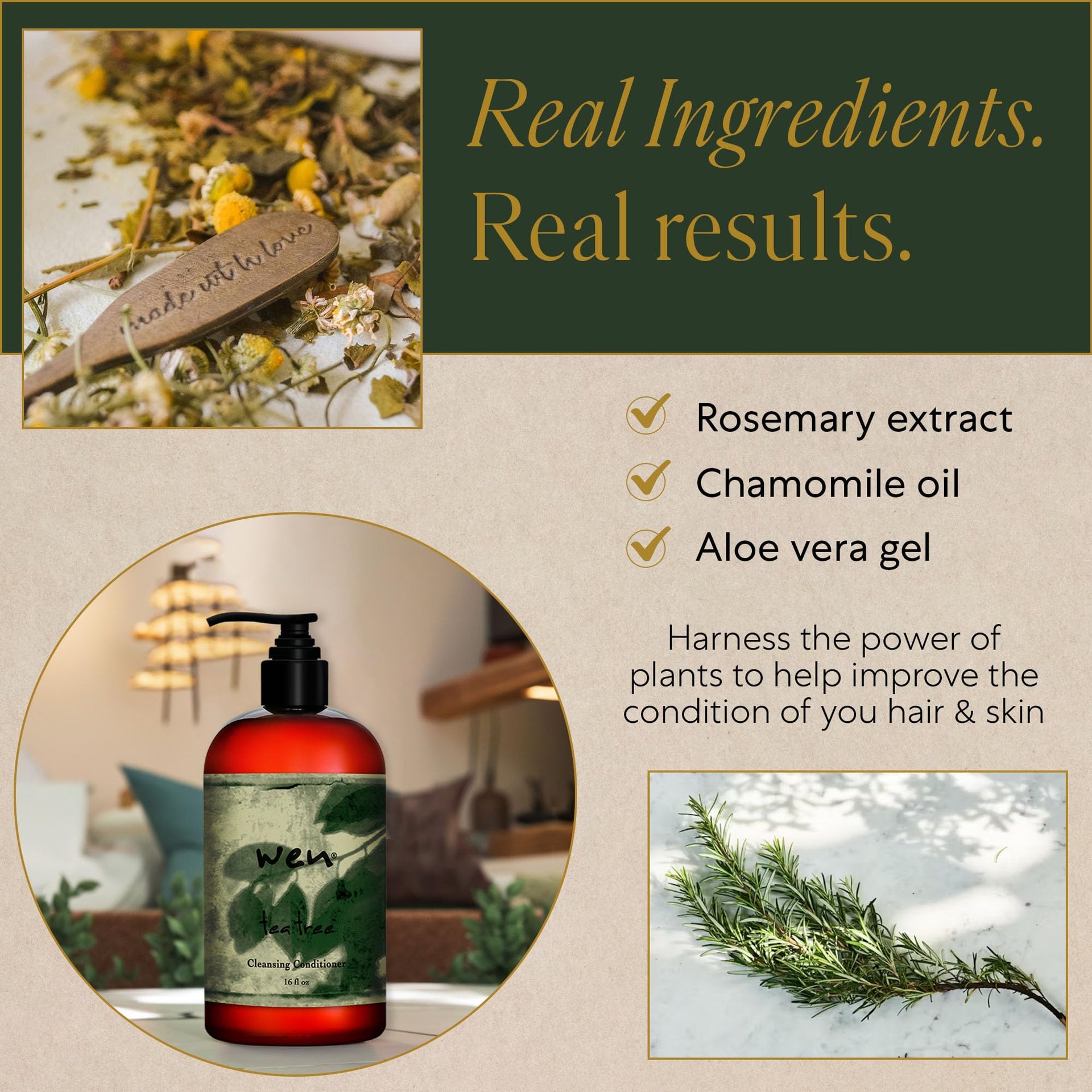 Details: WEN Tea Tree Cleansing Conditioner cleanses hair thoroughly but without lathering and all the harsh chemicals that may be found in ordinary shampoos. Your hair is left with sheen, moisture, and manageability.