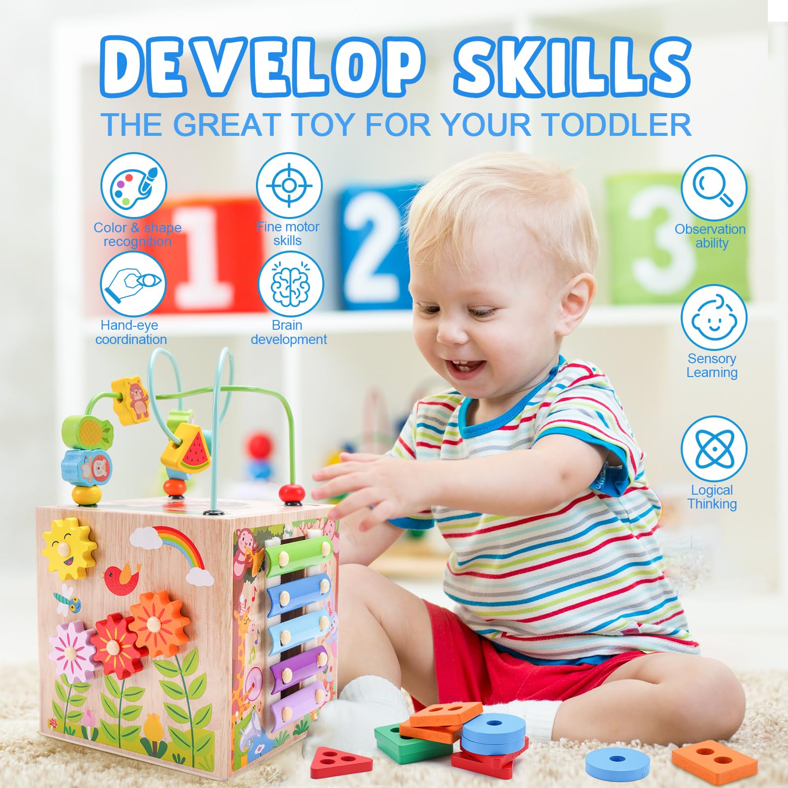 Wooden Activity Cube for Toddlers | Montessori Educational Toy for 1-3 Years | 1st Birthday Gift | Sorting & Stacking Game (Pink)