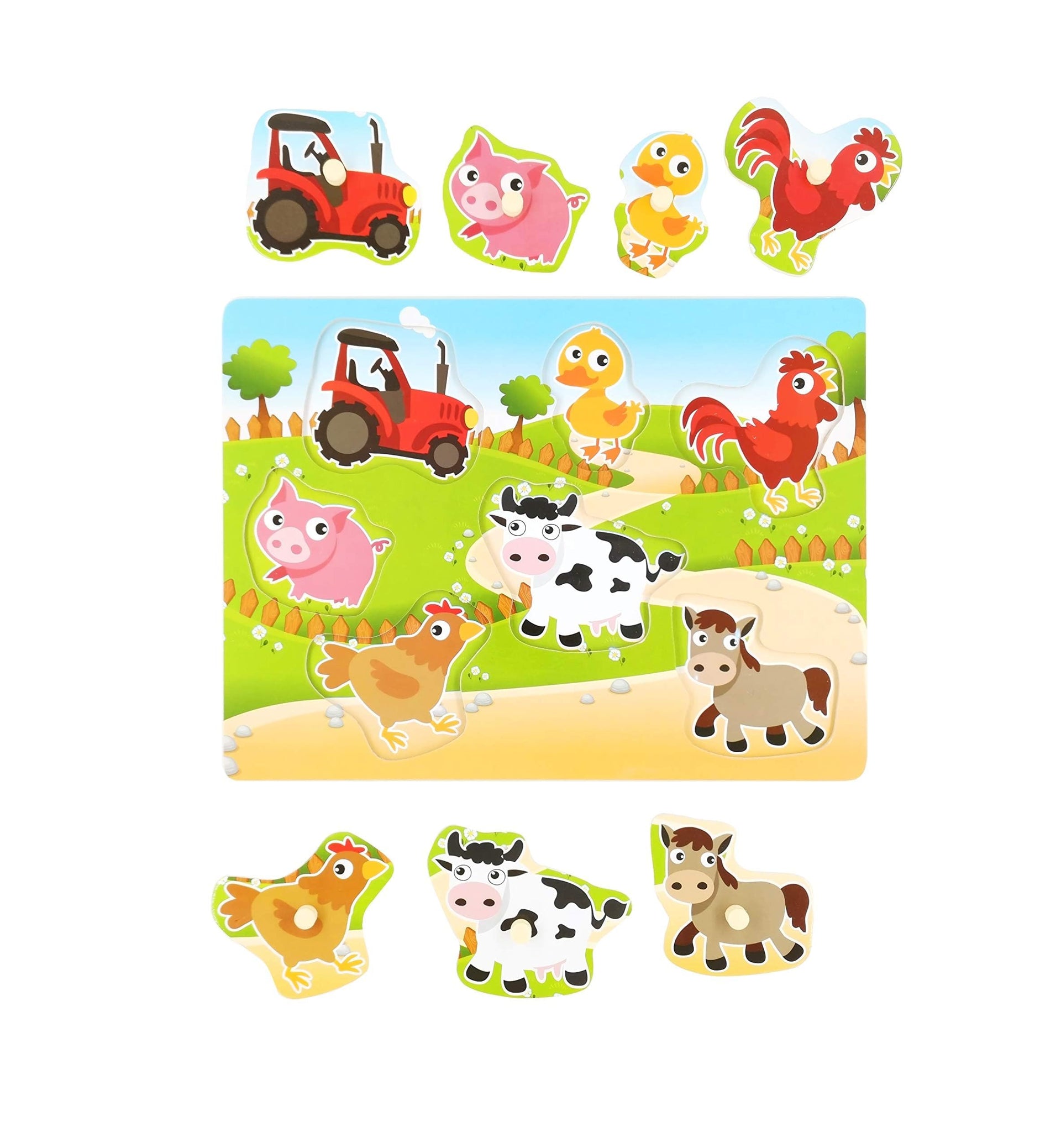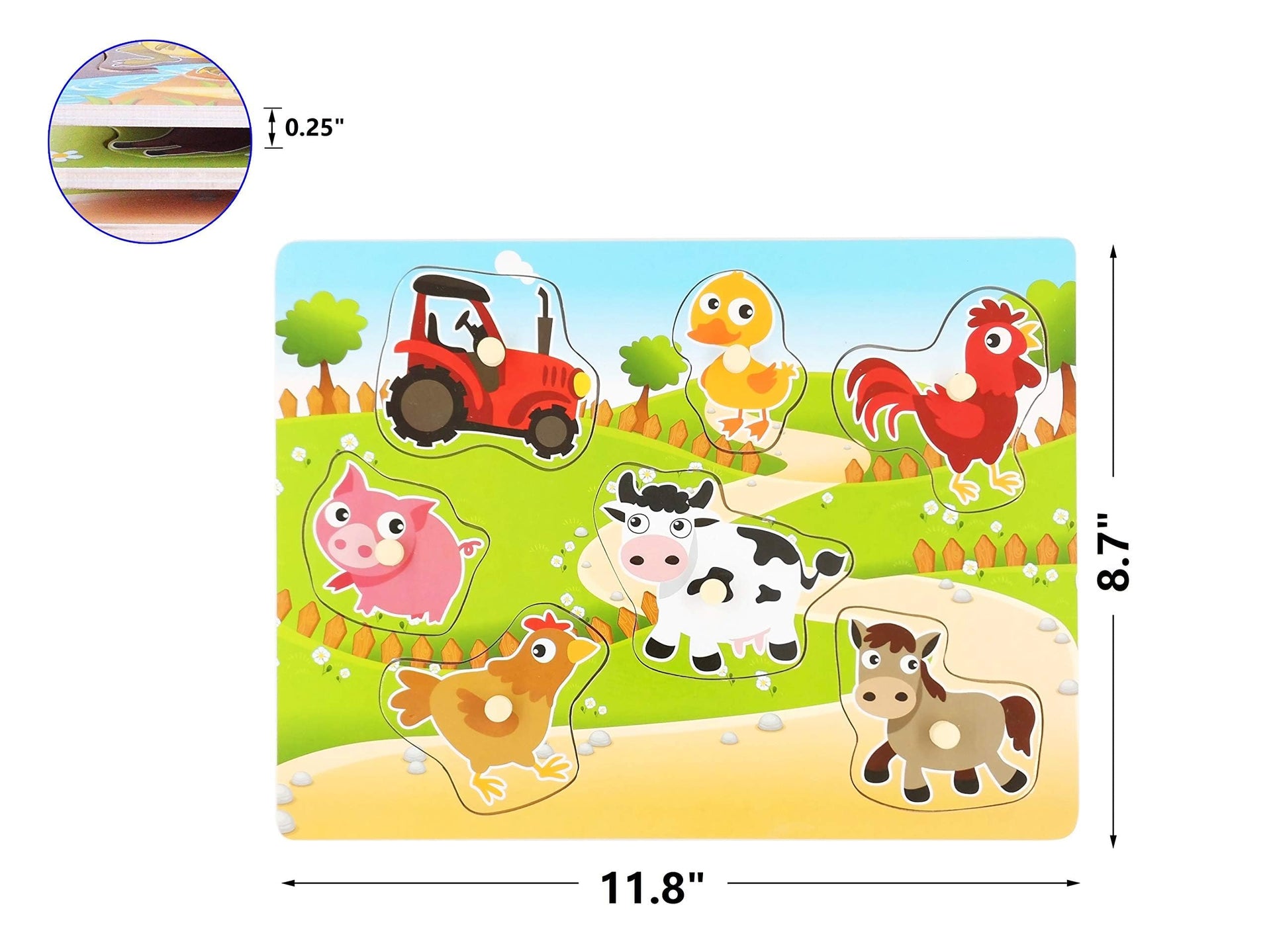 - Farm theme wooden peg puzzles feature 7pcs easy-to-grasp parts that appearing bright colors and illustrations of tractor and farm poultry.
