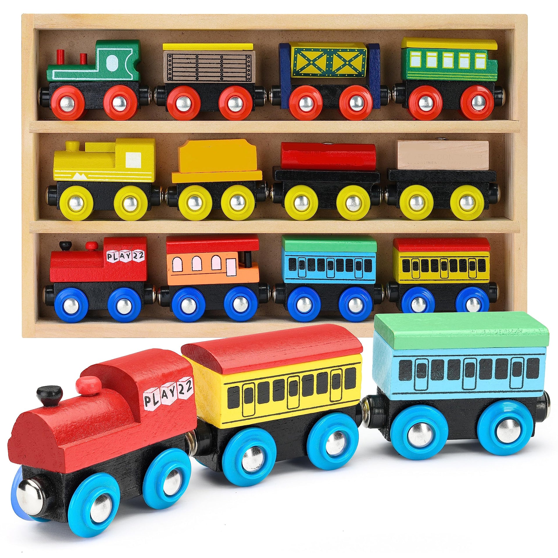 Play22 Wooden Train Set 12 PCS - Magnetic Train Toys with 3 Engines, Compatible with All Major Brands for Toddlers & Kids